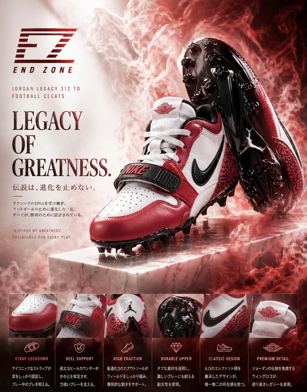 Jordan Legacy 312 TD フットボールスパイクは、スピードと安定性を両立させたハイブリッドモデル。カットの鋭さとフィット感を高め、試合の中で一歩抜け出すために設計されています。
